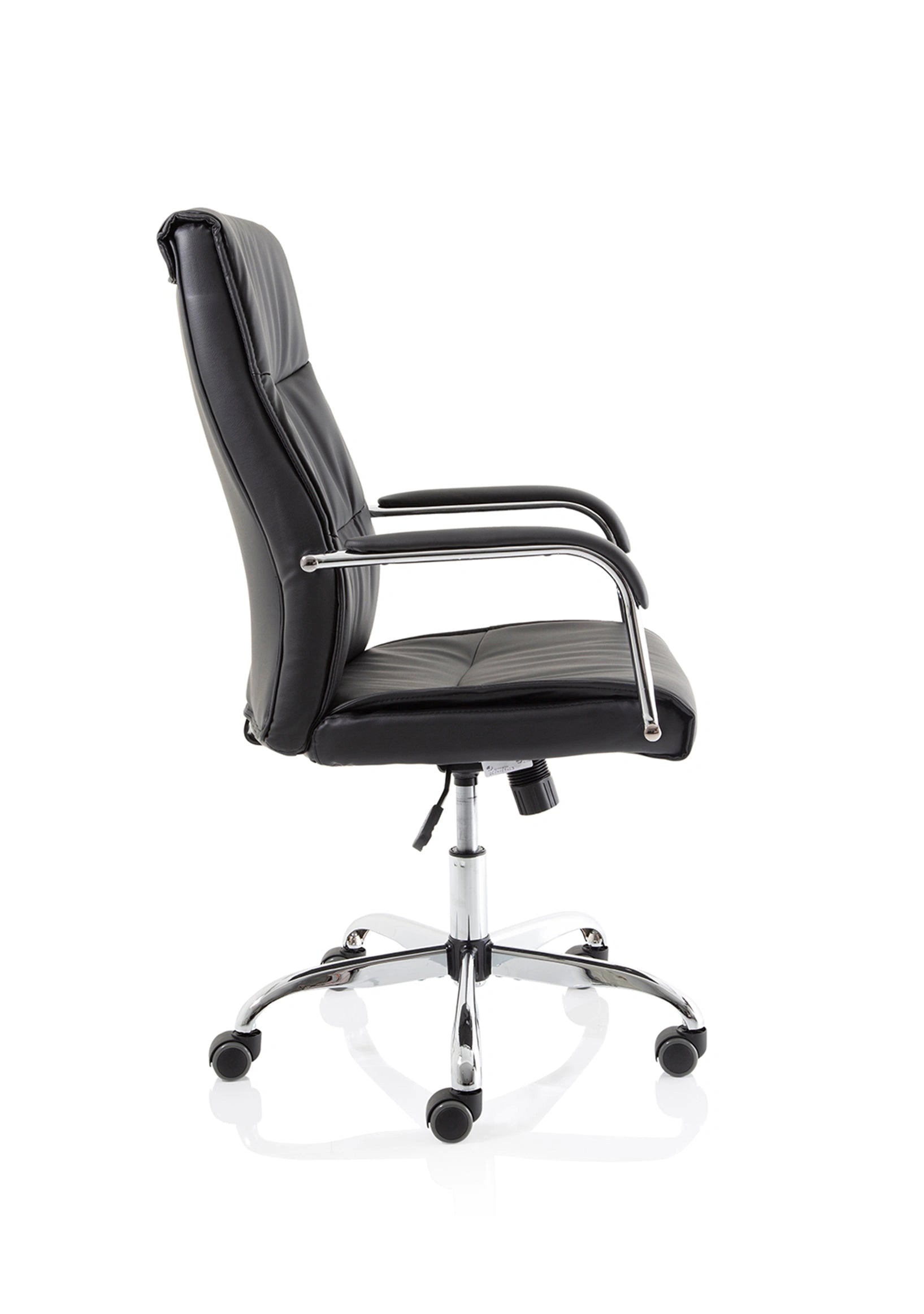 Luxury at a fraction of the usual cost. This high back Carter chair in faux leather has stitch detailing, deep foams and a padded armrest on a chrome frame. A clear case of Get Carter.