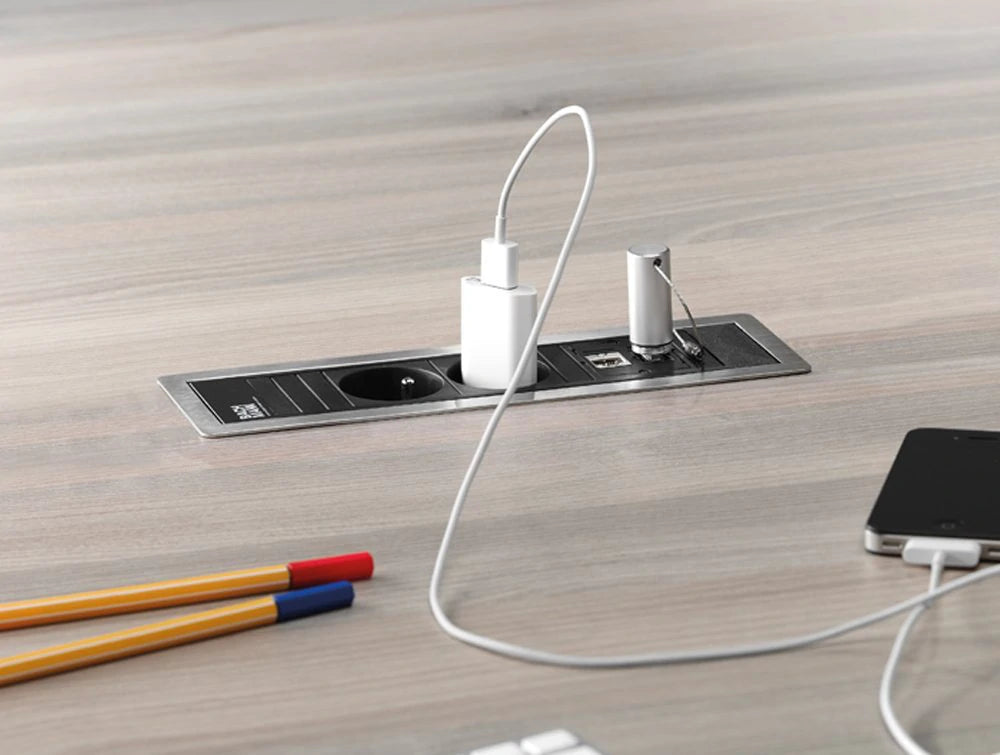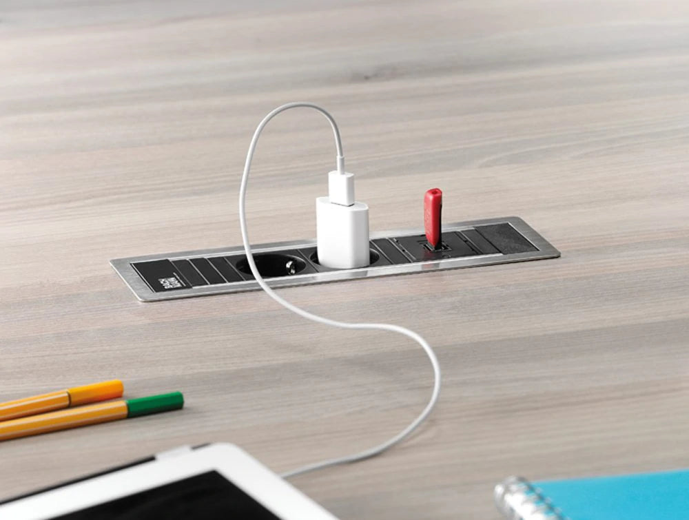 The Power Frame provides complete power strips for your office desk, and features compact dimensions. It's quick to install and versatile to use.