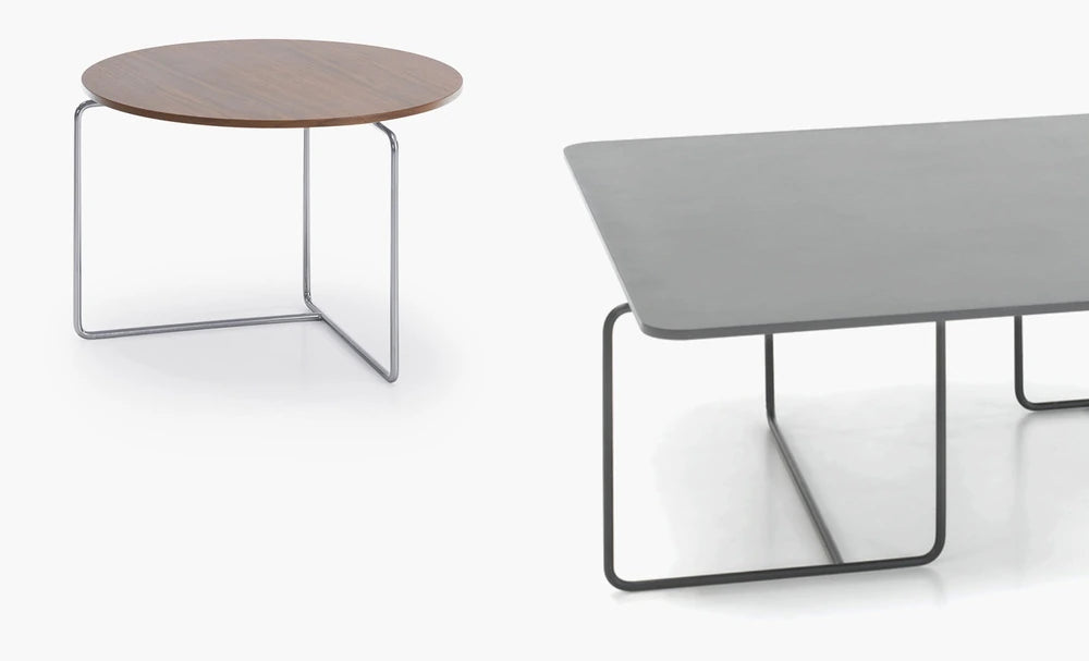 Collection of tables with characteristic oval edges of the table top combined with a square Sectional frame varnished in black or grey. Table top is covered with modified oak veneer in three colours: milk, coffee or cocoa.