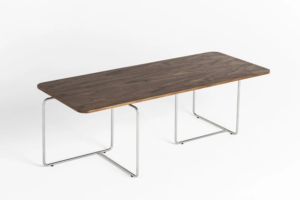 Collection of tables with characteristic oval edges of the table top combined with a square Sectional frame varnished in black or grey. Table top is covered with modified oak veneer in three colours: milk, coffee or cocoa.